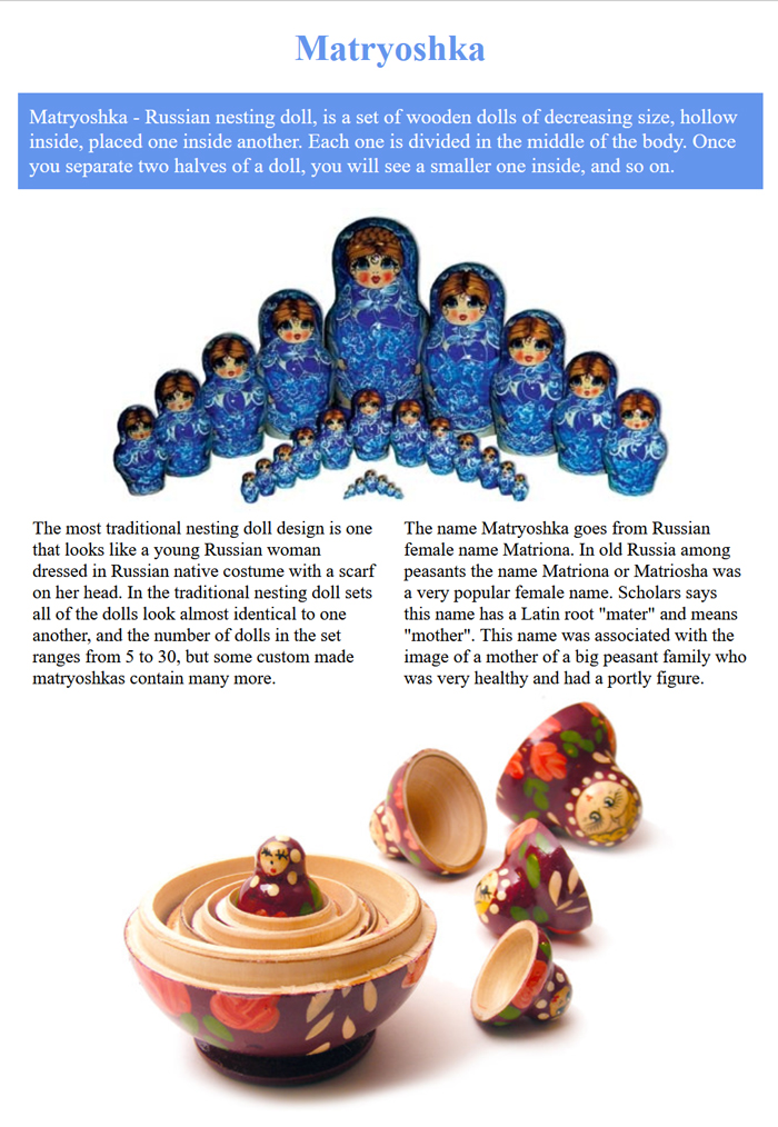Matryoshka - Russian nesting doll, is a set of wooden dolls of decreasing size, hollow inside, placed one inside another. Each one is divided in the middle of the body. Once you separate two halves of a doll, you will see a smaller one inside, and so on.